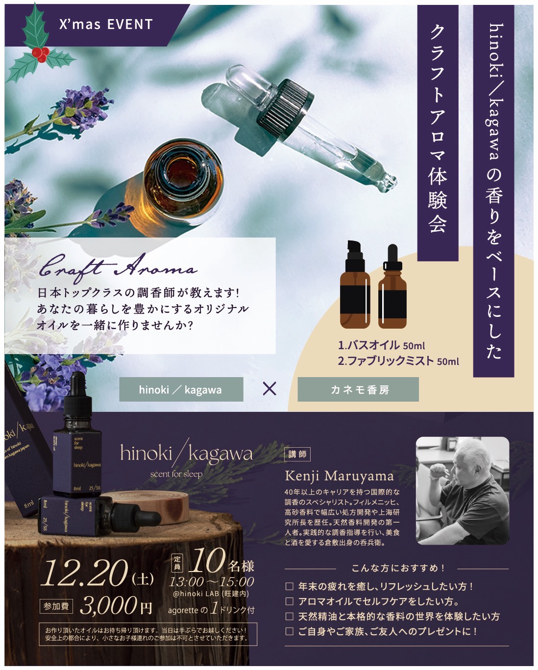 12/20(土)、hinoki/kagawaの香りをベースにしたクラフトアロマ体験会を開催します。