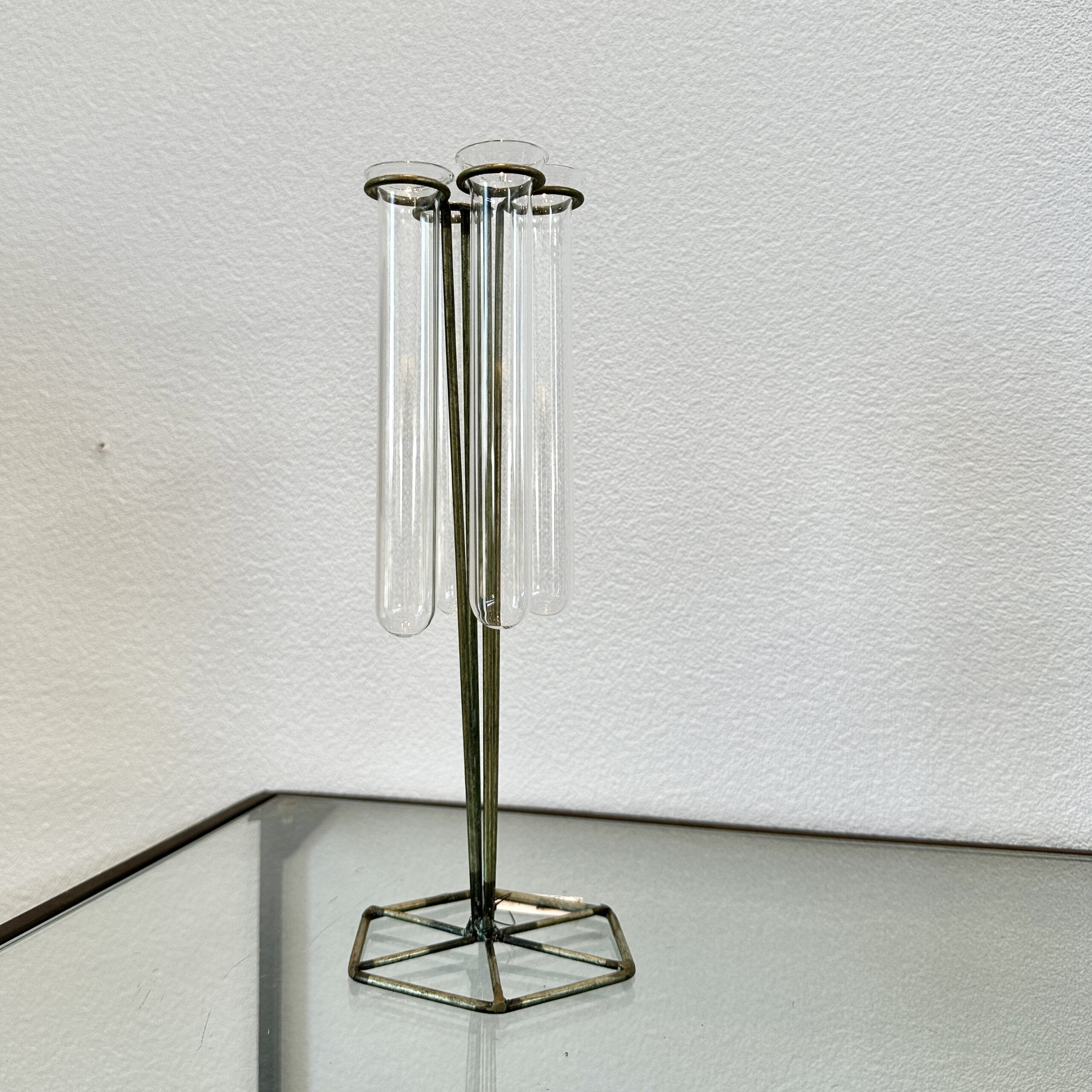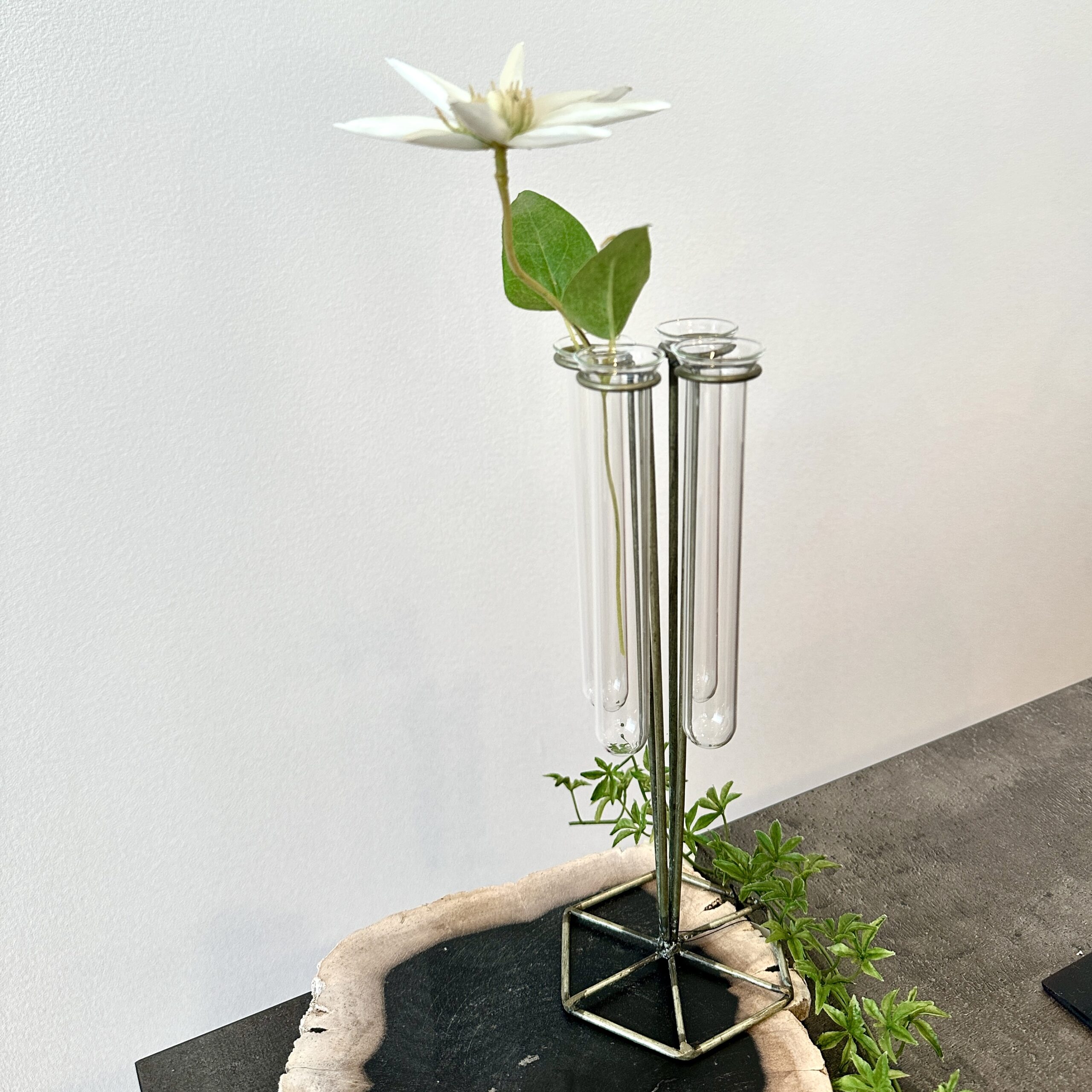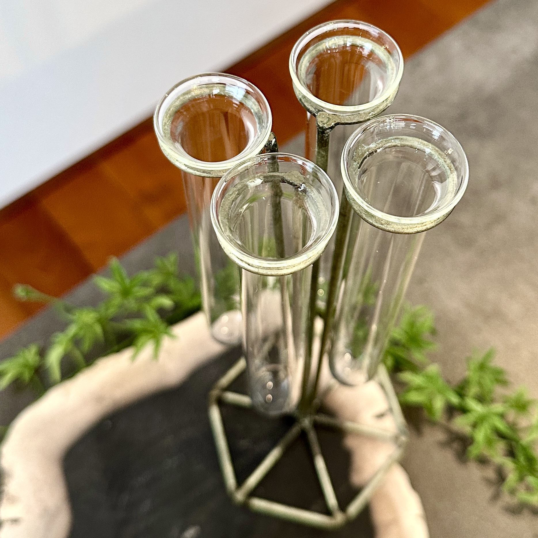 すっと伸びたフレームに、ガラスの試験管を4本あしらった一輪挿し。