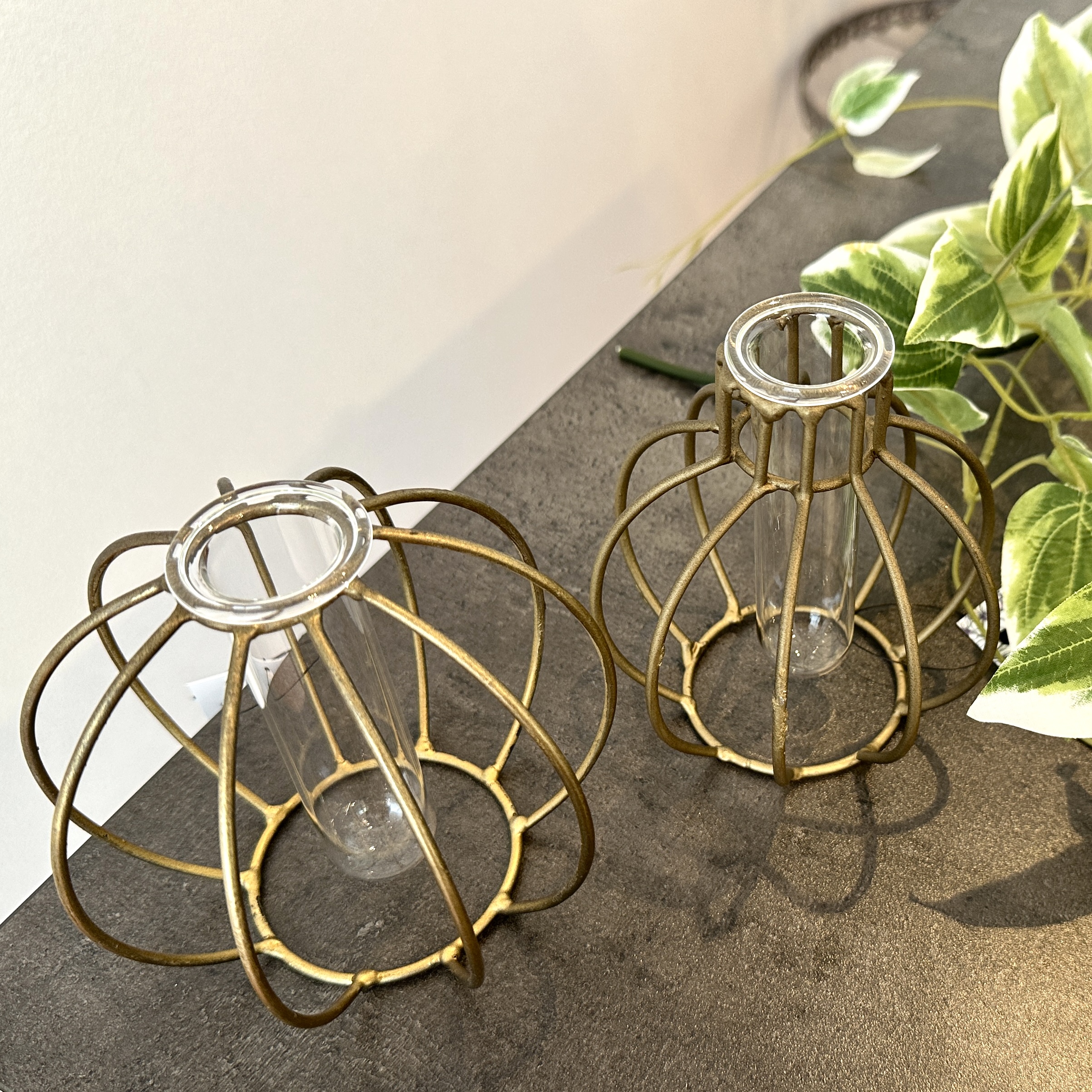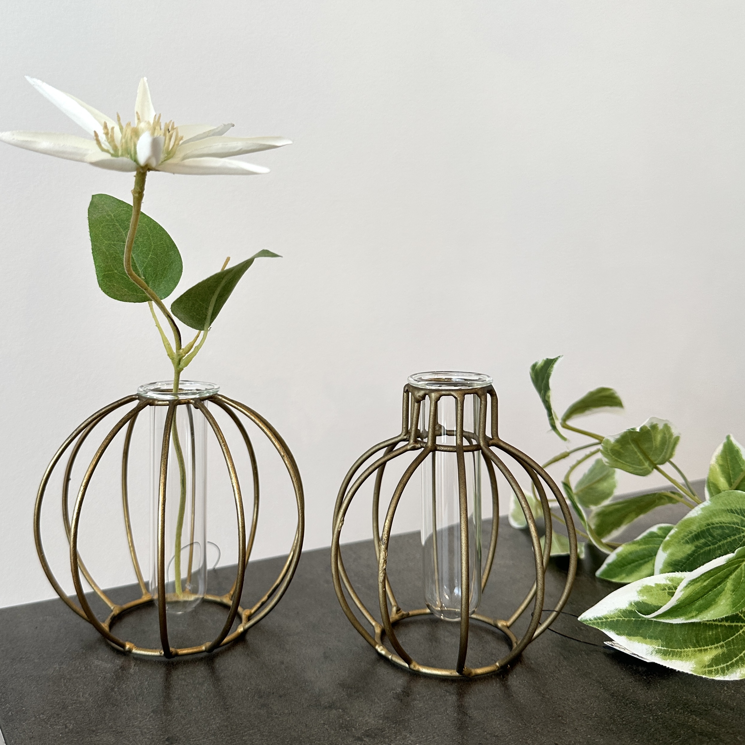 丸みを帯びたメタルフレームの中に、ガラスのチューブベースを収めたフラワーベース。